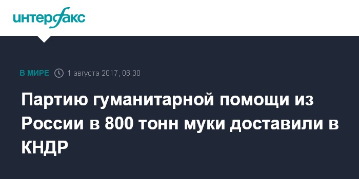 Москва. 1 августа. INTERFAX.RU - Около 800 тонн пшеничной муки доставлено в КНДР из приморского порта Находка, сообщается на странице посольства России в Северной Корее.