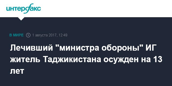 Москва. 1 августа. INTERFAX.RU - В Душанбе к 13 годам лишения свободы приговорен местный житель, который оказывал в Сирии медицинскую помощь экс-командиру ОМОН МВД Таджикистана Гулмуроду Халимову, перешедшему на сторону террористической организации "Исламское государство" (ИГИЛ, запрещена в РФ).
