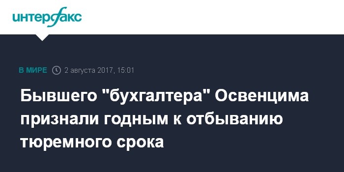 Москва. 2 августа. INTERFAX.RU - В Германии прокуроры пришли к выводу, что осужденный на четыре года служивший в концлагере Освенцим бывший эсэсовец, 95-летний Оскар Грёнинг, способен отбывать тюремное заключение. Об этом сообщает ABC News.