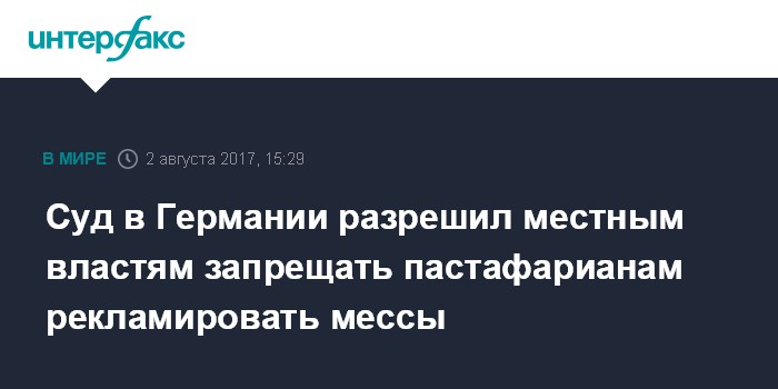 Москва. 2 августа. INTERFAX.RU - Суд в ФРГ постановил, что региональные власти имеют право препятствовать Церкви летающего макаронного монстра (пастафарианам - ИФ) рекламировать "макаронные мессы" у въезда в Темплин (земля Бранденбург), сообщило в среду агентство АР.
