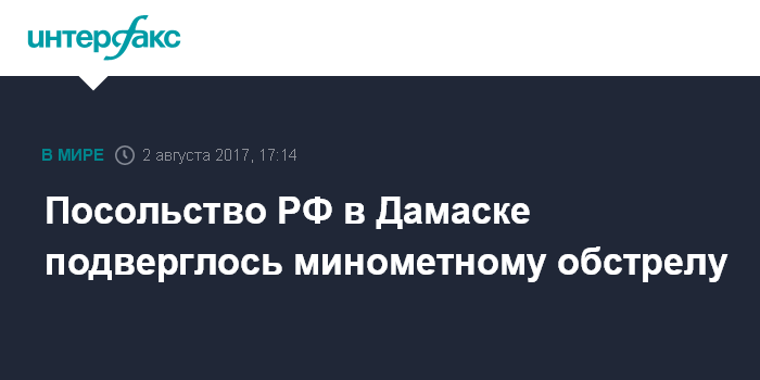 "2 августа комплекс посольства России в Дамаске подвергся минометному обстрелу со стороны позиций боевиков террористических бандформирований. Два снаряда упали на территорию российской дипмиссии, еще два - разорвались в непосредственной близости от внешнего периметра загранучреждения. По счастливой случайности обошлось без жертв, имеется незначительный материальный ущерб", - говорится в сообщении на сайте МИД РФ.