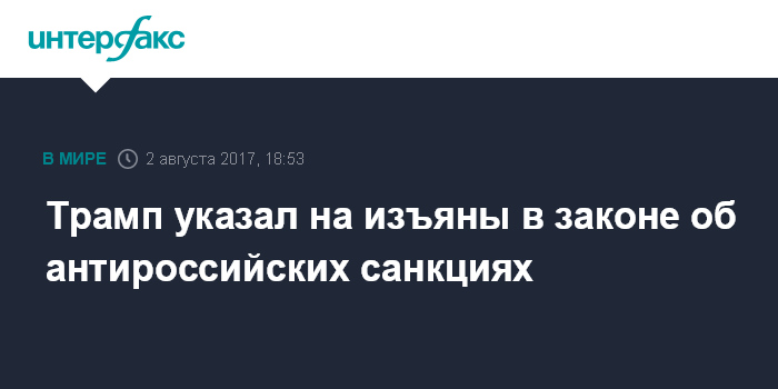 "Несмотря на его (закона - ИФ) недостатки, я подписываю этот документ во благо национального единства. Оно отражает волю американского народа увидеть, как Россия предпринимает шаги по улучшению отношений с Соединенными Штатами. Мы надеемся на сотрудничество между нашими двумя странами по ряду основных глобальных вопросов, чтобы в этих санкциях больше не было необходимости", - говорится в заявлении Трампа, опубликованном в связи с подписанием антироссийских санкций.