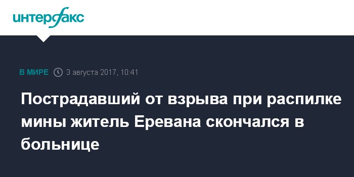 Москва. 3 августа. INTERFAX.RU - В больнице умер один из пострадавших при взрыве боеприпаса минувшим вечером в Ереване. Об этом сообщили в четверг "Интерфаксу" в пресс-службе МЧС Армении.