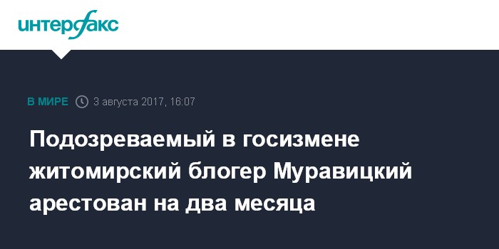 Москва. 3 августа. INTERFAX.RU - Житомирский суд избрал меру пресечения задержанному ранее по подозрению в государственной измене житомирскому блогеру Василию Муравицкому. Об этом сообщили агентству "Интерфакс" в Службе безопасности Украины.