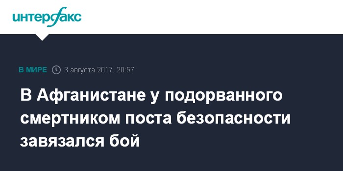 Москва. 3 августа. INTERFAX.RU - Террорист-смертник на заминированном автомобиле атаковал пост сил безопасности в уезде Гиришк провинции Гильменд на юге Афганистана.