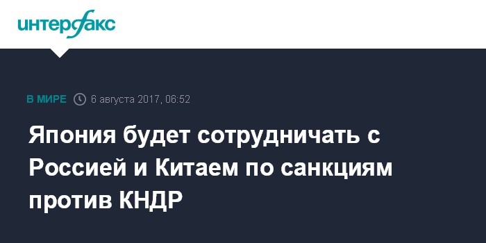 Москва. 6 августа. INTERFAX.RU - Премьер-министр Японии Синдзо Абэ заявил, что японская сторона будет тесно сотрудничать с мировым сообществом, включая Россию и Китай, в вопросе соблюдения санкций, наложенных СБ ООН на КНДР.