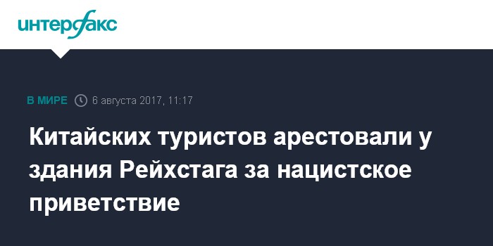 Москва. 6 августа. INTERFAX.RU - Немецкая полиция арестовала двоих туристов из Китая, после того как они изобразили нацистское приветствие перед зданием Рейхстага в Берлине.