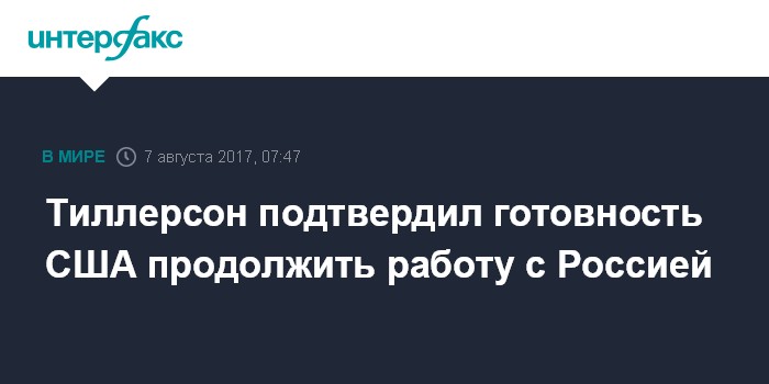 Москва. 7 августа. INTERFAX.RU - Госсекретарь США Рекс Тиллерсон заявил, что Вашингтон готов продолжать сотрудничество с Россией, и что бессмысленно разрывать связи из-за существующих разногласий.