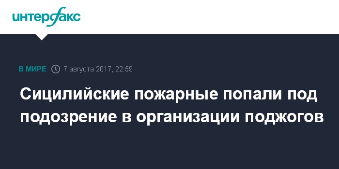 Москва. 7 августа. INTERFAX.RU - Полиция Сицилии подозревает 15 сотрудников пожарной службы в организации поджогов, сообщили в понедельник европейские СМИ.