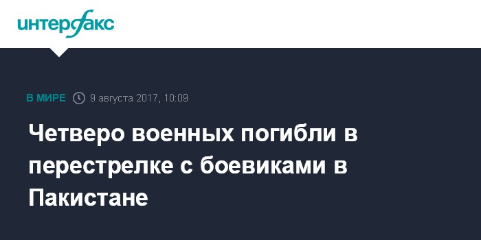 Москва. 9 августа. INTERFAX.RU - Четверо пакистанских военнослужащих погибли в среду во время перестрелки с боевиками близ границы с Афганистаном. Об этом сообщает агентство Associated Press.