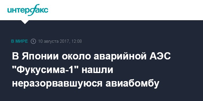 Москва. 10 августа. INTERFAX.RU - В Японии в 300 метрах от аварийной атомной электростанции "Фукусима-1" обнаружили неразорвавшуюся авиабомбу, сброшенную авиацией США во время Второй мировой войны, сообщает в четверг агентство "Дзидзи".