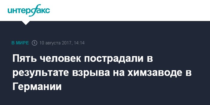 Москва. 10 августа. INTERFAX.RU - Взрыв произошел на территории химического завода на западе Германии, пострадали пять человек, пишет в четверг немецкая газета Der Westen.