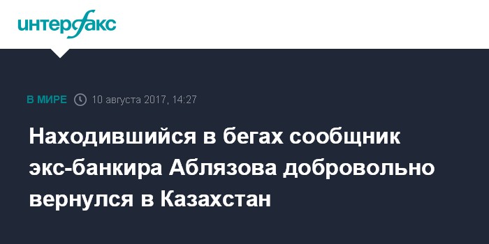 Москва. 10 августа. INTERFAX.RU - В Казахстан вернулся один из сообщников бывшего главы "БТА банка" Мухтара Аблязова - Ержан Кадесов, сообщила пресс-служба Нацбюро по противодействию коррупции республики.