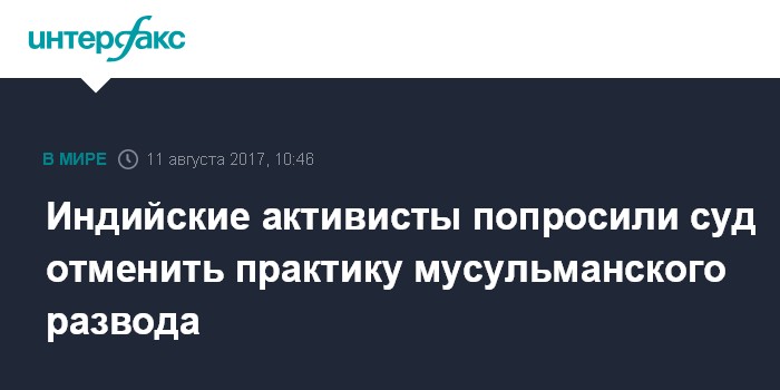 Москва. 11 августа. INTERFAX.RU - Председателю Верховного суда Индии подана петиция об отмене "тройного талака" - процедуры развода, принятой у мусульман, сообщают индийские СМИ.