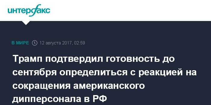 Москва. 12 августа. INTERFAX.RU - Президент США Дональд Трамп подтвердил в субботу, что до 1 сентября определится с ответом на решение Москвы о сокращении американского дипломатического персонала в РФ.