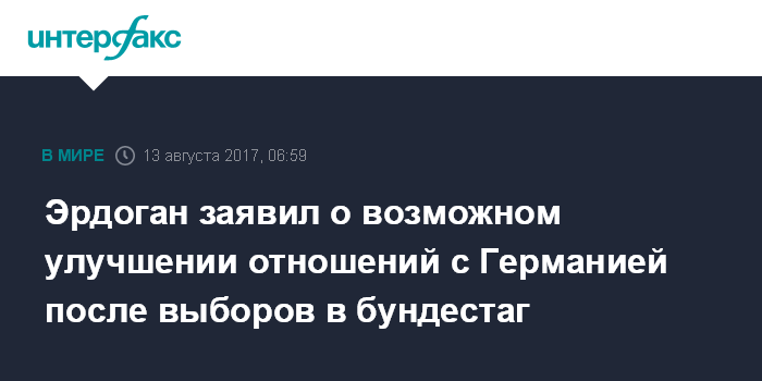 Москва. 13 августа. INTERFAX.RU - Президент Турции Реджеп Тайип Эрдоган надеется на улучшение отношений с Германией после выборов в бундестаг 24 сентября, заявил он в эфире турецкого телевидения, сообщает Deutsche Welle.