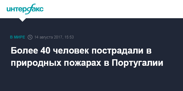 Москва. 14 августа. INTERFAX.RU - По меньшей мере 45 человек получили травмы за последние два дня в результате природных пожарах в центральной части Португалии, сообщает в понедельник агентство АР со ссылкой на пресс-секретаря Агентства гражданской обороны страны Патрисию Гашпар.