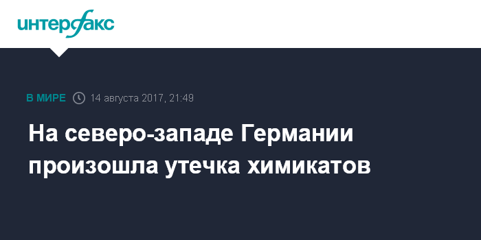Москва. 14 августа. INTERFAX.RU - Утечка химических веществ произошла в немецкой коммуне Эмсбюрен (земля Нижняя Саксония), в результате чего двое человек пострадали, передает в понедельник немецкий телеканал NDR.