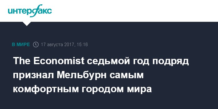 Москва. 17 августа. INTERFAX.RU - Австралийский Мельбурн вновь признан самым лучшим городом для жизни, говорится в ежегодном рейтинге, который составляет журнал The Economist. Австралийский город в седьмой раз подряд возглавил рейтинг из 140 городов, набрав 97,5 из 100 баллов. "Серебряным" призером стала Вена, а следом идет "канадская тройка": Ванкувер, Торонто и Калгари.