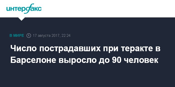 Москва. 17 августа. INTERFAX.RU - Правительство Каталонии заявило, что 90 человек поступили в больницы с различными травмами после наезда фургона на пешеходов в центре Барселоны, сообщает в четверг местные El Periodico.