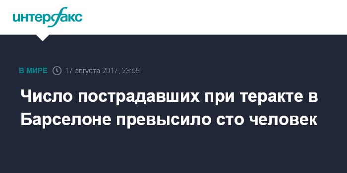 Москва. 17 августа. INTERFAX.RU - Число пострадавших при теракте в Барселоне превысило 100 человек, сообщает El Pais со ссылкой на местные власти.