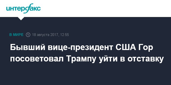 Москва. 18 августа. INTERFAX.RU - Бывший вице-президент США Альберт Гор высказал мнение, что президенту США Дональду Трампу следует покинуть пост, сообщает британское издание The Daily Mail.