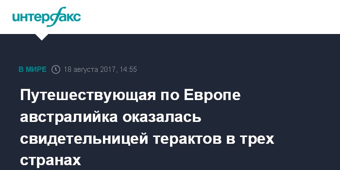 Москва. 18 августа. INTERFAX.RU - Туристка из Мельбурна Джулия Монако, пережившая накануне теракт в Барселоне, ранее в этом году оказывалась вблизи мест нападений 3 июня в Лондоне и 6 июня в Париже, сообщает британское издание The Independent. Сейчас Монако путешествует по странам Европы.