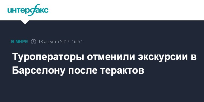 Москва. 18 августа. INTERFAX.RU - Туроператоры отменили на ближайшие дни экскурсии в Барселону и ее окрестности после произошедших в четверг терактов в Испании, сообщила "Интерфаксу" пресс-секретарь Российского союза туриндустрии (РСТ) Ирина Тюрина.