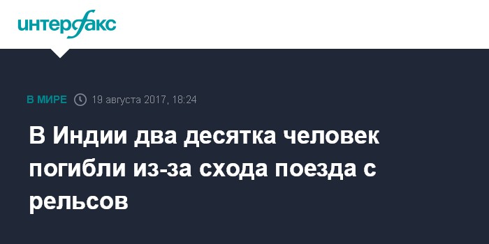 Москва. 19 августа. INTERFAX.RU - По меньшей мере 20 человек погибли и свыше 50 получили ранения в результате схода поезда с рельсов в индийском штате Уттар-Прадеш, сообщает индийский ресурс India Today.