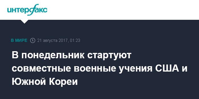 Москва. 21 августа. INTERFAX.RU - Южная Корея и США начнут в понедельник двухнедельные совместные военные учения "Страж свободы Ульчи", подобные тем, которые проводились в 2016 году. Как ожидается, маневры пройдут как минимум до 31 августа.