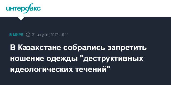 Москва. 21 августа. INTERFAX.RU - В Казахстане планируют законодательно запретить распространение и рекламирование вероучений "деструктивных идеологических течений" в СМИ, а также ношение предметов их одежды, сообщила пресс-служба Министерства по делам религий и гражданского общества республики.