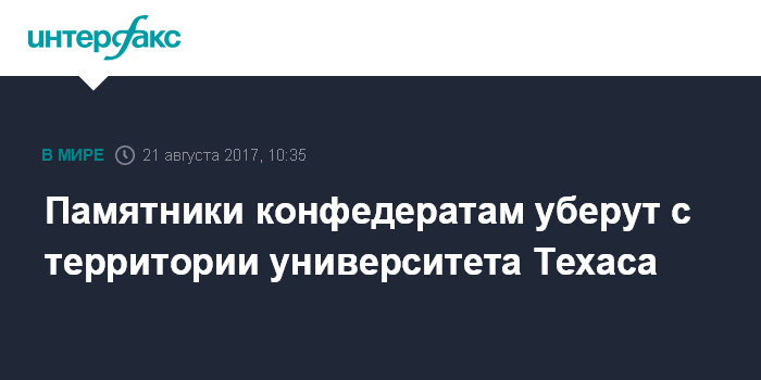 Москва. 21 августа. INTERFAX.RU - Глава Университета Техаса Грег Фенвс распорядился о демонтаже памятников военнослужащим армии Конфедерации времен Гражданской войны в США с территории учебного заведения. Об этом сообщает в понедельник агентство Associated Press.