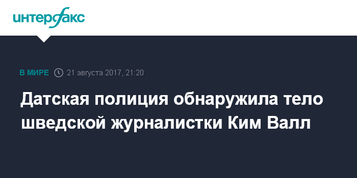 Москва. 21 августа. INTERFAX.RU - Датские правоохранительные органы обнаружили в территориальных водах Дании тело женщины, в которой опознали пропавшую журналистку Ким Валл, сообщил в понедельник шведский телеканал SVT Nyheter.