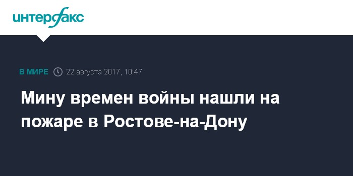 Москва. 22 августа. INTERFAX.RU - При разборе завалов после пожара в Ростове-на-Дону обнаружена мина времен Великой Отечественной войны, сообщил на заседании правительства региона начальник ГУ МЧС РФ по Ростовской области Валерий Синьков.