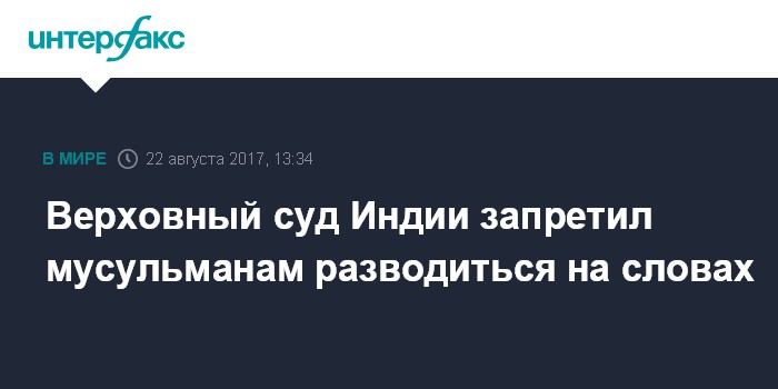 Москва. 22 августа. INTERFAX.RU - Верховный суд Индии запретил в стране практикуемый мусульманами развод "тройной талак", согласно которому мужчина может развестись с супругой, трижды произнеся слово "талак", сообщает во вторник "Би-би-си".