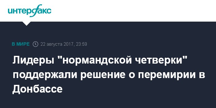 "22 августа 2017 года главы государств и правительств стран "нормандского формата" - России, Германии, Франции и Украины - провели телефонный разговор. Лидеры решительно поддержали ожидаемое 23 августа решение Контактной группы об объявлении прекращения огня по случаю начала учебного года", - говорится в сообщении.