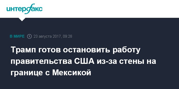 Москва. 23 августа. INTERFAX.RU - Президент США Дональд Трамп готов остановить работу правительства, чтобы добиться финансирования строительства гигантской стены на границе с Мексикой, сообщает агентство Associated Press.