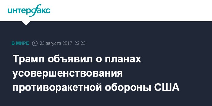 Москва. 23 августа. INTERFAX.RU - Президент США Дональд Трамп заявил в среду в городе Рино (штат Невада), что американская администрация намерена уделять особое внимание совершенствованию противоракетной обороны США.