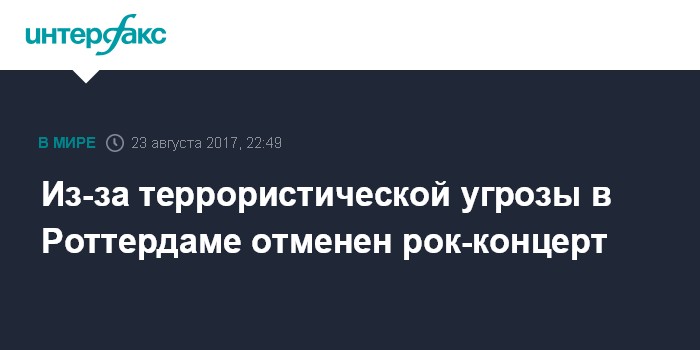 Москва. 23 августа. INTERFAX.RU - Рок-концерт отменен в среду в последнюю минуту в нидерландском городе Роттердам ввиду террористической угрозы, сообщает Общественное радиовещание Нидерландов (НОС).