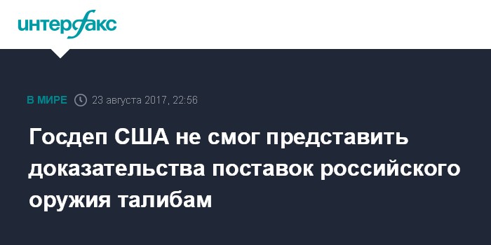 Москва. 23 августа. INTERFAX.RU - Официальный представитель госдепартамента США Хизер Нойерт не смогла предоставить журналистам доказательства того, что Россия якобы поставляет вооружения радикальному афганскому движению "Талибан" (запрещено в РФ).