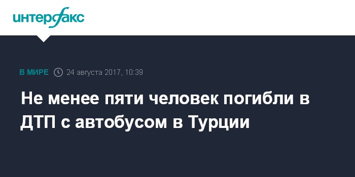 Москва. 24 августа. INTERFAX.RU - Не менее пяти человек погибли в Турции в результате ДТП с пассажирским автобусом, который следовал из Измира в Анкару. Об этом сообщает газета Hurriyet.