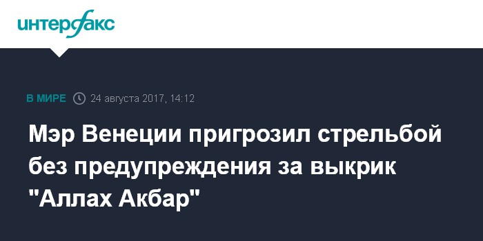 Москва. 24 августа. INTERFAX.RU - Мэр Венеции Луиджи Бруньяро пригрозил заблаговременно отправить террористов "к Аллаху" за выкрики "Аллах Акбар" на площади Святого Марка, сообщает издание The Sun.