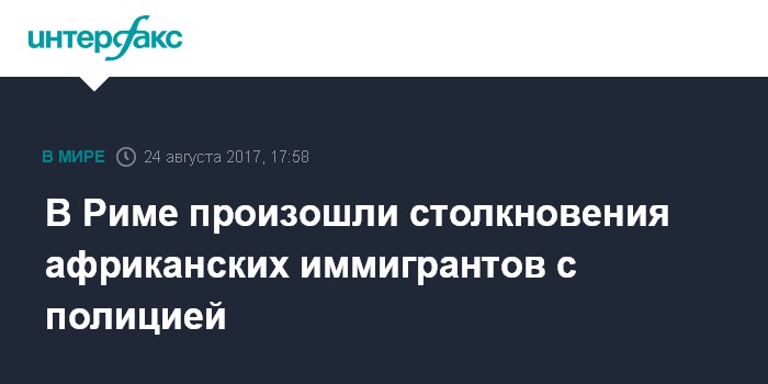 Москва. 24 августа. INTERFAX.RU - На одной из площадей Рима в четверг произошли столкновения иммигрантов, в основном из Эфиопии и Эритреи, с представителями сил правопорядка, сообщило агентство Associated Press.