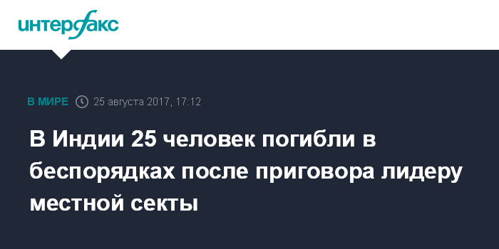 Москва. 25 августа. INTERFAX.RU - По меньшей мере 25 человек погибли в ходе столкновений, последовавших за оглашением вердикта суда местному "духовному лидеру", которого признали виновным в изнасиловании. Такие данные приводит The Hindustan Times.