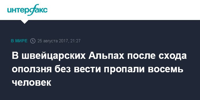 Москва. 25 августа. INTERFAX.RU - Сотрудники экстренных служб ведут поиски восьми человек, которые пропали без вести в швейцарских Альпах после схода оползня в среду, сообщают в пятницу западные СМИ.