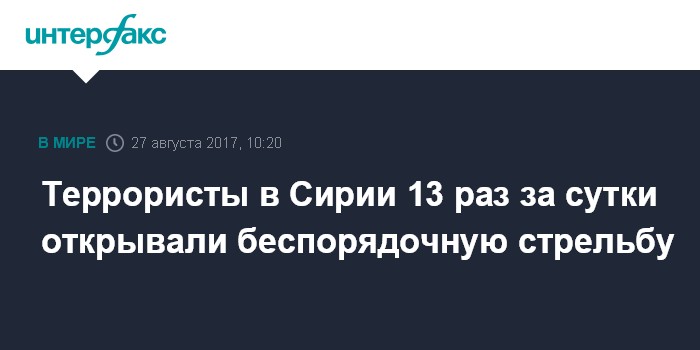 Москва. 27 августа. INTERFAX.RU - Российская сторона зафиксировала в Сирии за сутки семь случаев стрельбы, турецкая - шесть, сообщило в воскресенье Минобороны РФ.