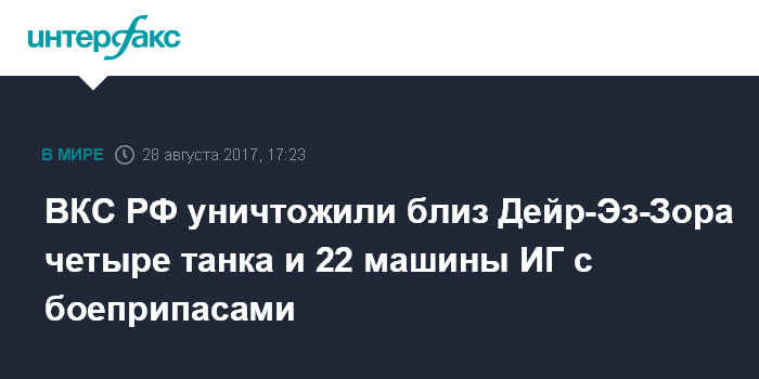 Москва. 28 августа. INTERFAX.RU - Российская авиация за ночь и текущий день уничтожила в районе сирийского Дейр-Эз-Зора четыре танка и более 20 автомобилей террористов, сообщили в Минобороны РФ.