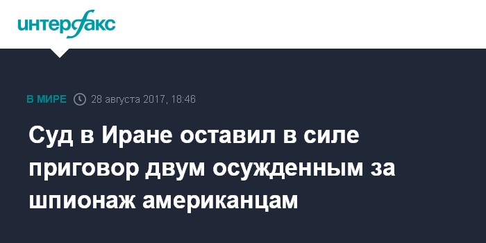 Москва. 28 августа. INTERFAX.RU - Иранский суд отказал в удовлетворении апелляции граждан США Сиамака и Бакера Намази, отбывающих 10-летний срок в иранской тюрьме по обвинениям в шпионаже, передает в понедельник агентство АР.