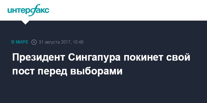 Москва. 31 августа. INTERFAX.RU - Седьмой президент Сингапура Тони Тан Кен Ям складывает свои полномочия в преддверии президентских выборов, которые намечены на 23 сентября, пишет в четверг газета The Straits Times.