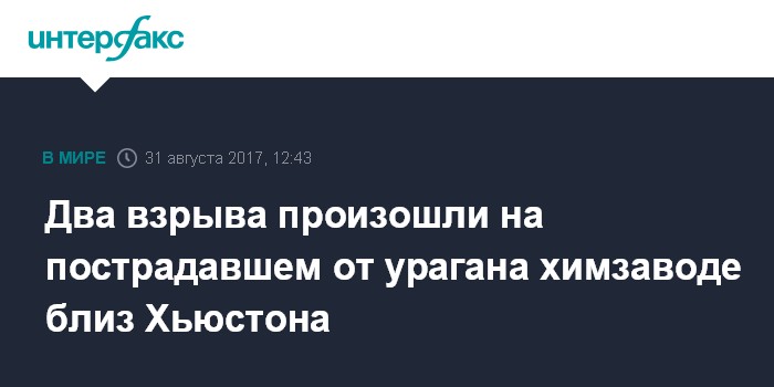 Москва. 31 августа. INTERFAX.RU - На затопленном химическом заводе в американском городе Хьюстон (штат Техас) произошло два взрыва, сообщает Bloomberg со ссылкой на заявление представителей компании Arkema, которой принадлежит предприятие.